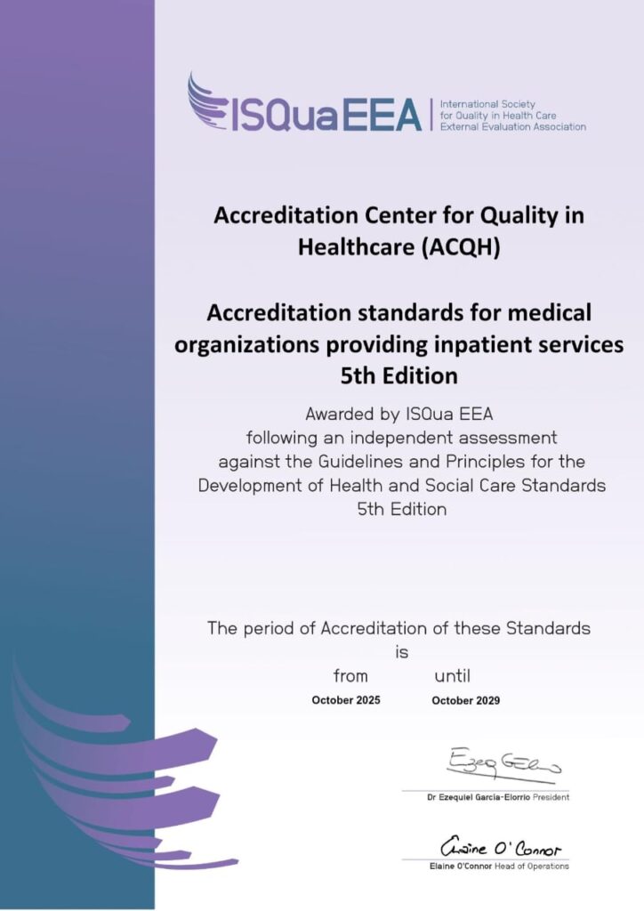 ОО «Accreditation Center for Quality in Healthcare» (ACQH) с гордостью сообщает о получении международной аккредитации ISQua External Evaluation Association (ISQua EEA) для Стандартов аккредитации медицинских организаций, оказывающих стационарные услуги (5-е издание) сроком на четыре года — с октября 2025 по октябрь 2029 года.